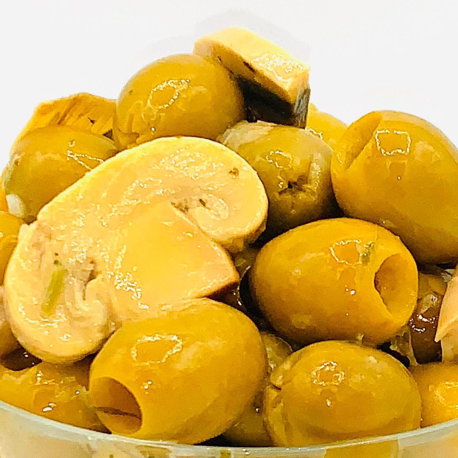 Pitted olives seasoned in oil with a touch of garlic and onion chopped in spices and mushrooms with our light touch in the purest grandmother’s style.